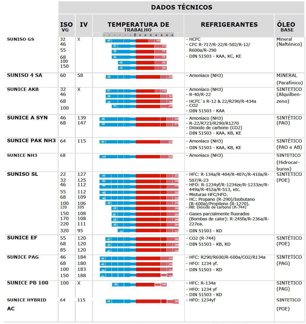 A Sunoco é especialista na formulação de óleos para a lubrificação de compressores de refrigeração. Utilizamos unicamente matérias-primas, óleos base e aditivos, de última geração para assegurarmos de que os nossos produtos proporcionarão um rendimento superior mesmo em condições de trabalho extremas. Além disso, dispomos de uma extensa gama de produtos que nos permite recomendar o óleo adequado em função do tipo de compressor e gás refrigerante em uso.